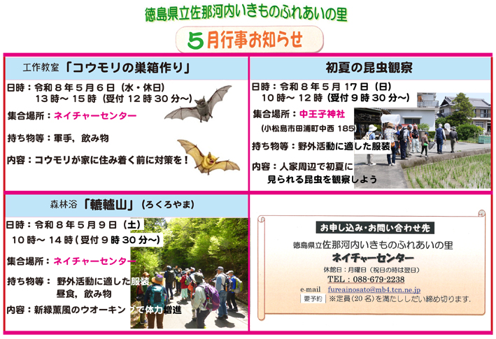 いきものふれあいの里の日々、イベント告知や里だより、四季折々の自然や里に集う人たちの様子を紹介しています。